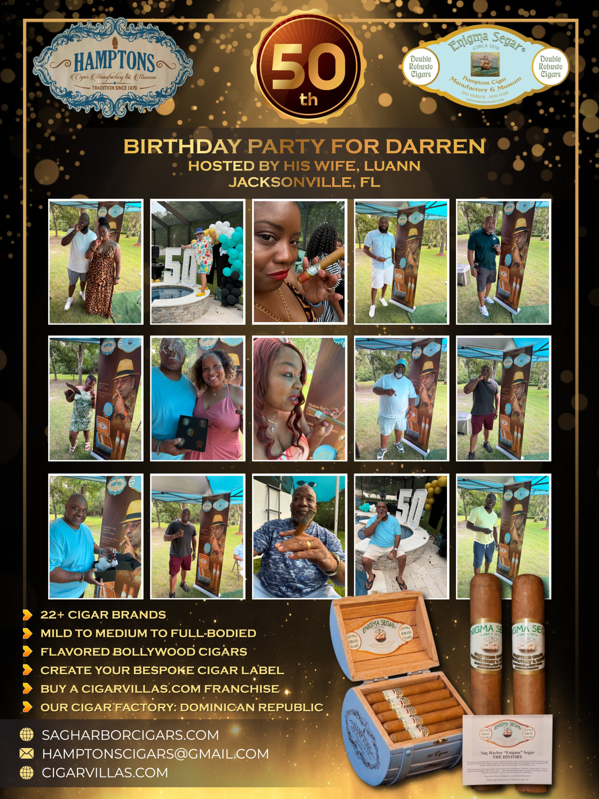 Each guest receives 10 cigars in different varietals and a souvenir picture (optional). We also offer you a 5 Pack of one of our cigar lines to do a raffle or drawing among your friends. We create a very high energy and very fun atmosphere.